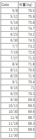 5/8に一念発起して始めたダイエットは、76.5→68.3 kg の 8.2kgマイナス(約半年)という結果であった。