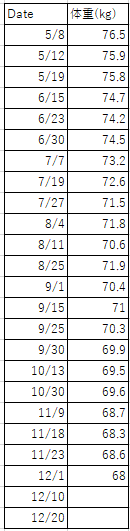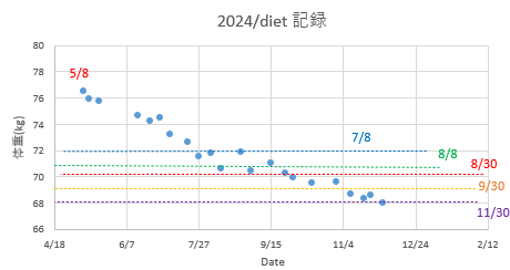 投稿日: 12月 1, 20241月 5, 20252024/12/1 (体重記録16) 人間ドック後も体重は減少傾向をKeep できている。 引き続き、まずは66kgを目指して継続していく。 11/9 68.7kg 11/18 68.3kg (2024年 健康診断) 11/23 68.6kg 12/1 68.0kg